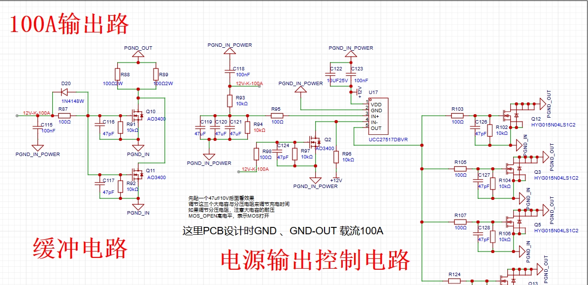 左边电路为缓冲电路,防止负载大电流冲击与打火。右边电路可搜看U17 (UCC27517DBVR)芯片手册得真值表,就可理解这里如何实现得软件与硬件都可控制输出得开关。