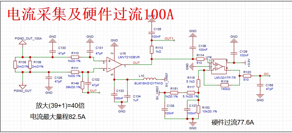 若要更改硬件过流值,可更改R151、R117、R153得值,更改R149、R111、R110可更改电流放大倍数,更改R119可更改滞回电压