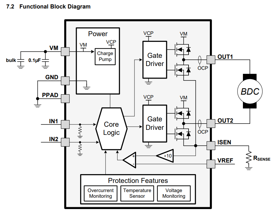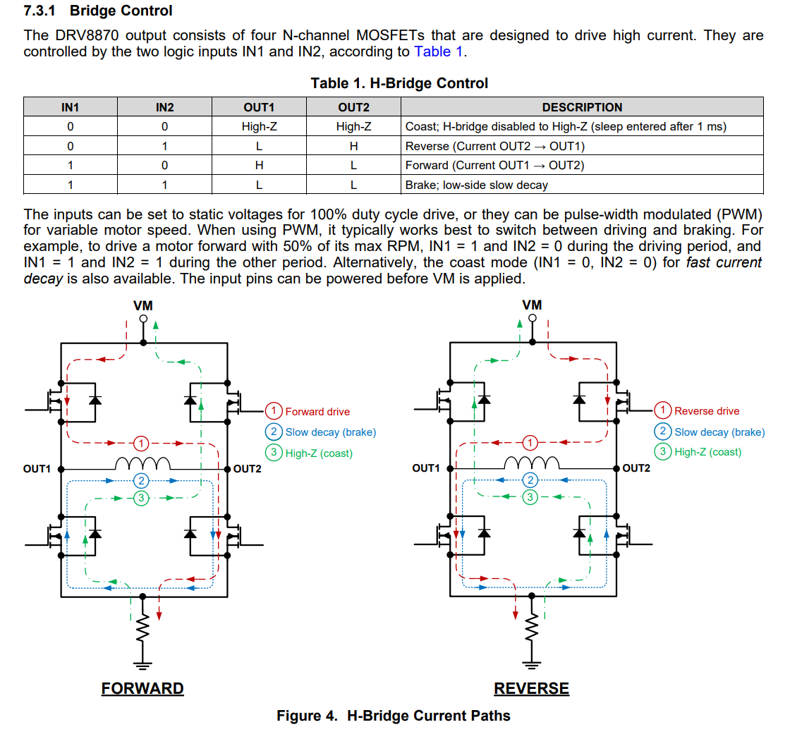 (1)本模块可兼容 DRV8870 与 国产AT8236 集成H桥芯片,两者可以pintopin替换,供电电压与峰值驱动电流均可达到36V/4A,具体可参阅两者datasheet。