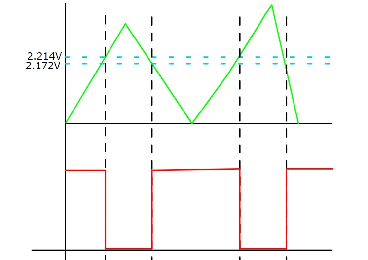 下图绿色线代表信号输入电压变化情况,从0电位上升,初始输出状态为高电平,输入电压达到2.214V时,输出信号变成低电平,直到输入信号低于下限阈值2.172V时输出变为高电平。可以根据比较器当前的输出状态来确定下一个变化电平的阈值,当输出为高电平时使用的是高阈值Uth,输出为低电平时使用低阈值Ttl。之所以将阈值设置接近是为了避免信号干扰造成的误识别。