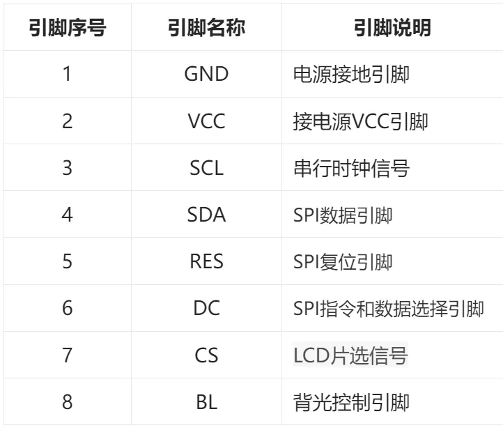 1.8 TFT 是一款彩色显示屏,具有 128 x 160 个彩色像素,使用四线SPI通信方式与单片机进行连接,一共有八根引脚,模块引脚说明及与单片机连接情况如下所示: