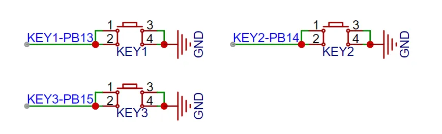 除了旋转编码器外,该项目还使用了三个独立按键对系统进行控制,三个按键一侧直接接地,另一侧连接到单片机引脚,当单片机引脚检测到按键按下时,单片机引脚直接接到GND接地,单片机收到该引脚接地信号的反馈后再去实现对应的功能,为节约硬件成本,可以在软件设计时引入消抖功能,避免机械按键抖动时的误触发。