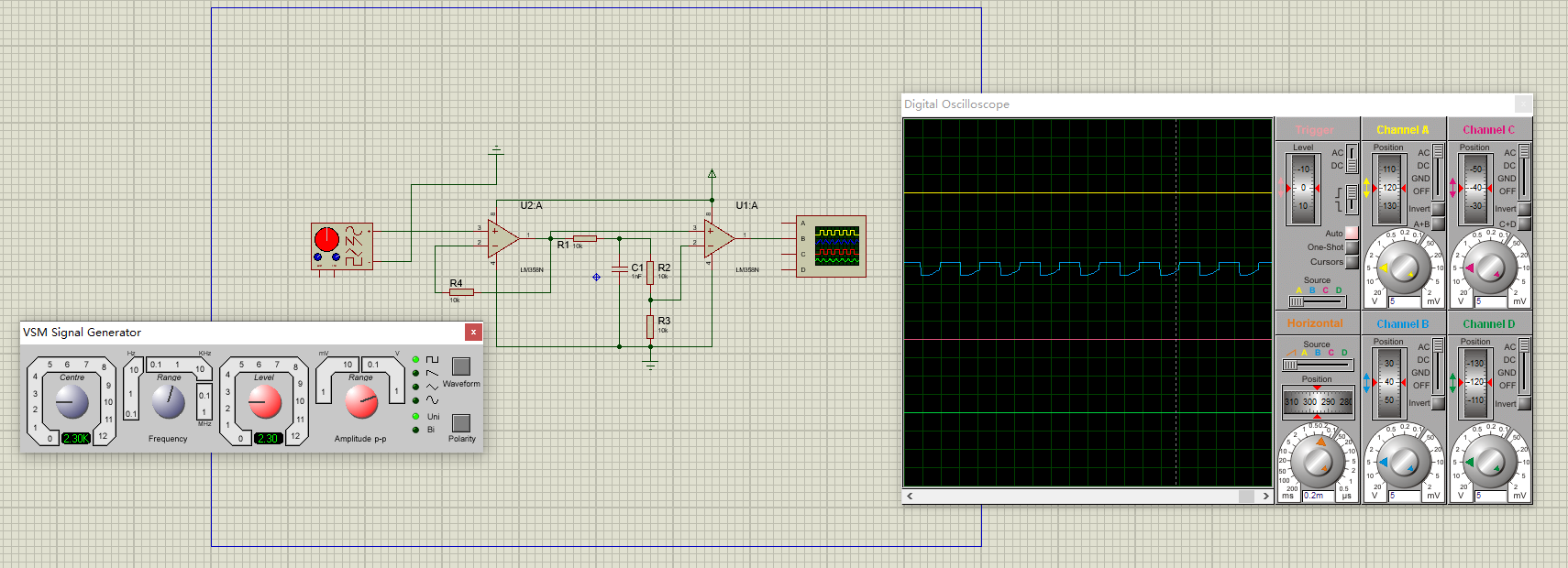 ADC模块仿真图 由积分电路和电压跟随组成 仿真目的是为了更好的获取R1和C1的值