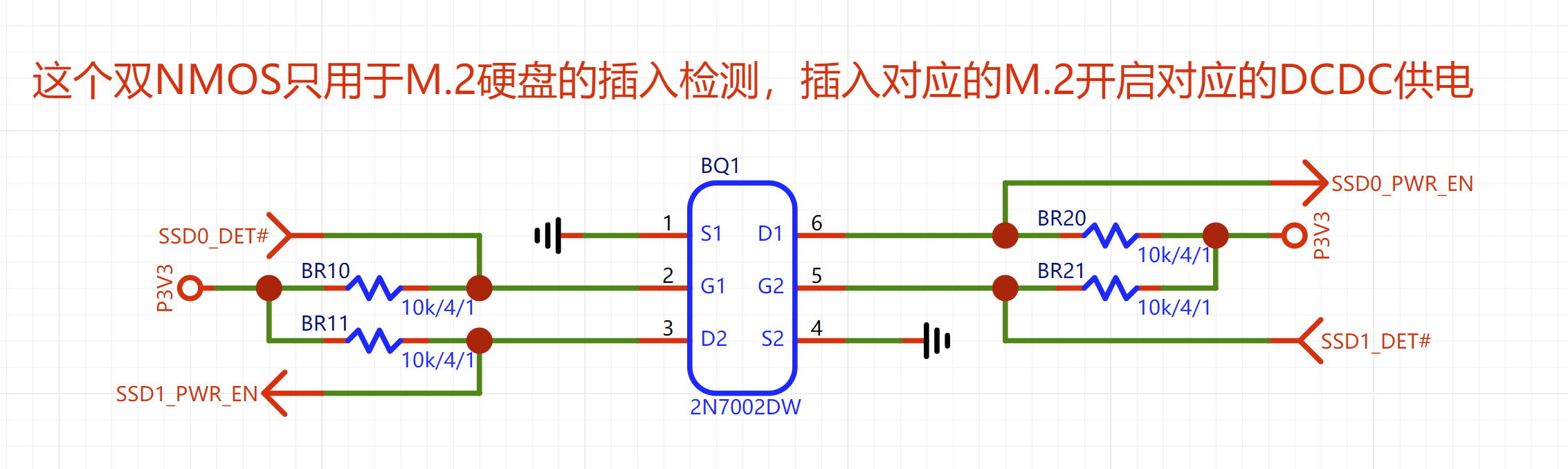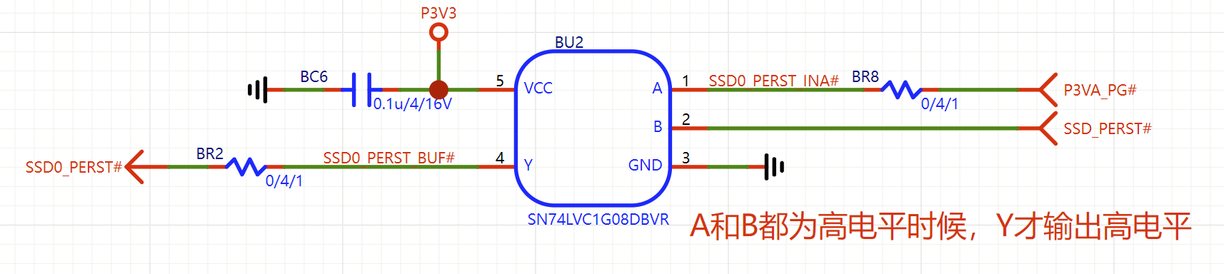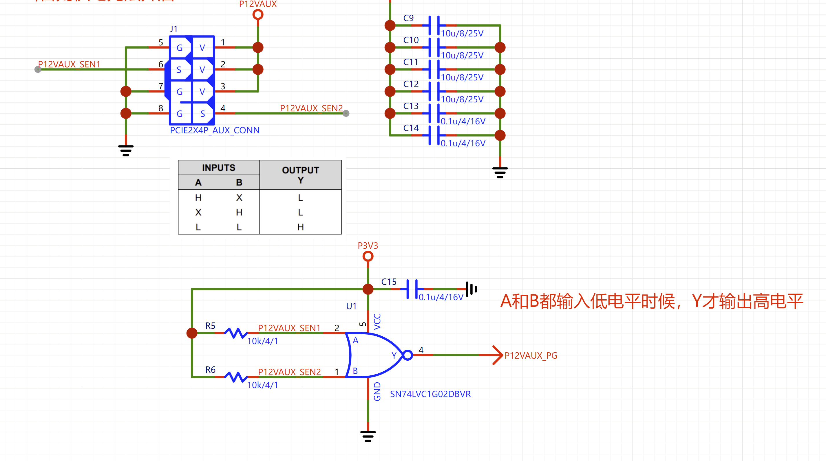 SN74LV1G02是单路双输入或非门,负责插入检测,A和B分别上拉3.3V接到外接6+2供电的2个检测脚上。当6+2P外接供电插入电源时,电源将2个引脚拉低,SN74LV1G02的Y脚就会输出高电平(芯片本身推挽,无需上拉电阻,电平等于VCC),从而开启1.8V的DC-DC BUCK降压控制器。