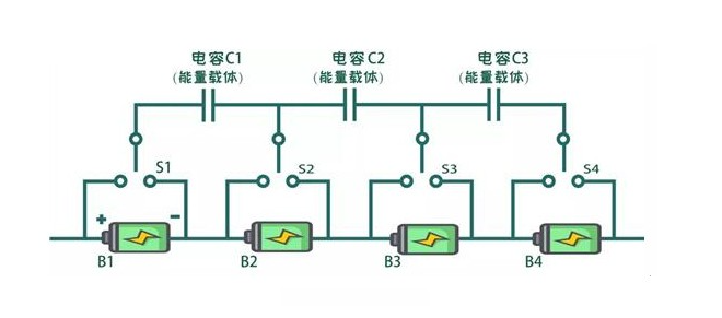 主体工作原理如图,驱动电路控制开关反复开关,让电容 反复并联到相邻的电池上,实现能量转移。