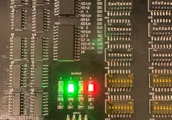 TD4-CPU的改进版。使用了较小的元件,将二极管放在背面,整个板子大小控制在10*10cm之内,能够在嘉立创免费打样。