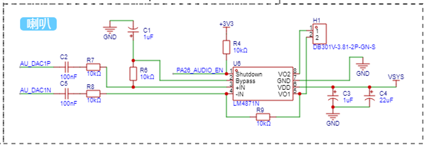 音频功放主要以上图的 U6 为主,它型号是 LM4871,是一款 3W、单声道 AB 类音频功率放大器,工作电压 1.9 - 5.5V。