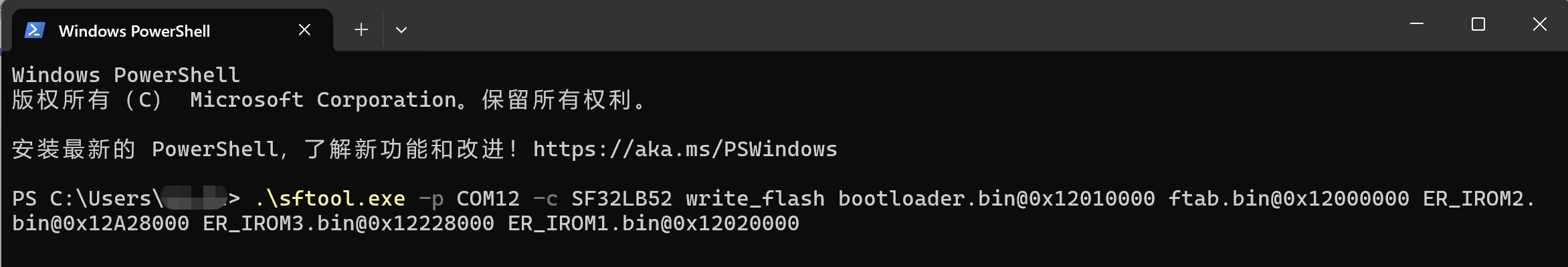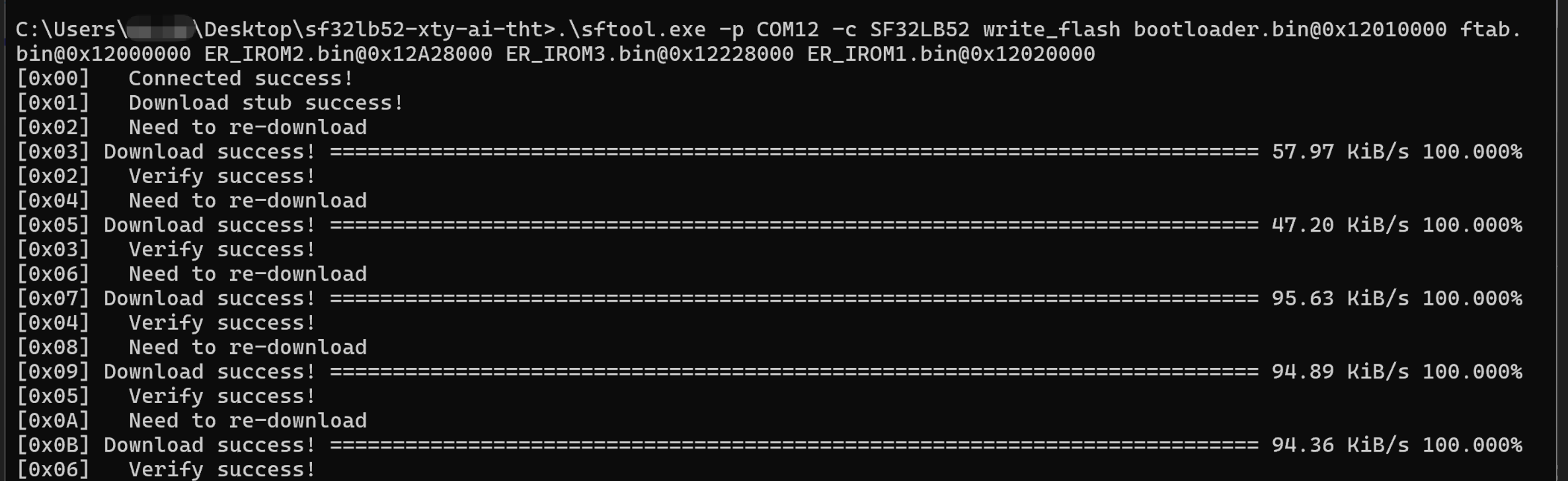 .\sftool.exe -p COM12 -c SF32LB52 write_flash bootloader.bin@0x12010000 ftab.bin@0x12000000 ER_IROM2.bin@0x12A28000 ER_IROM3.bin@0x12228000 ER_IROM1.bin@0x12020000