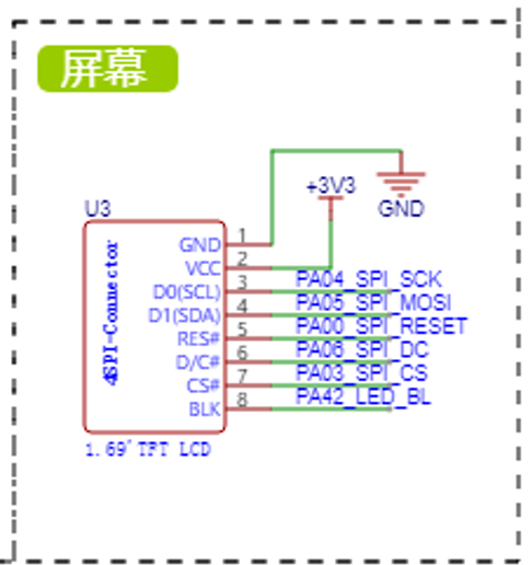 屏幕显示使用的是 1.69寸TFT屏幕,通过SPI协议控制,供电 3.3V。