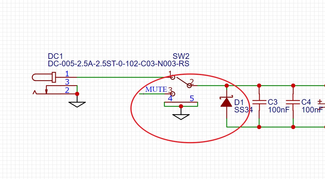钮子开关关闭时连接到TPA3116 MUTE脚,系统残留电源拉高MUTE脚,这样就消除了关机POP音!
