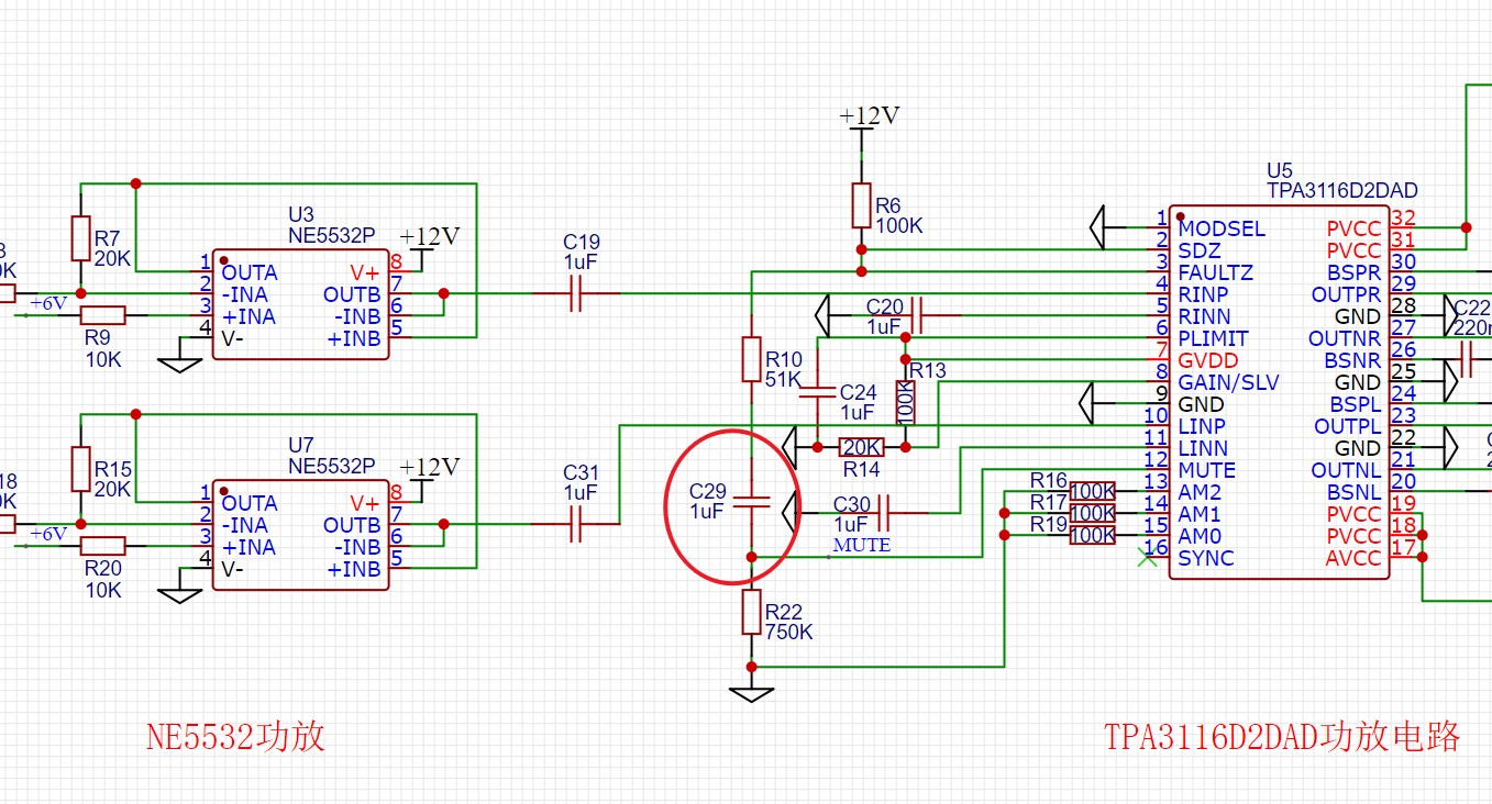 上电瞬间,MUTE脚被拉高进入静音模式,2~3秒后C29充满电后MUTE脚拉低,功放正常工作,这样开机POP音就消除了