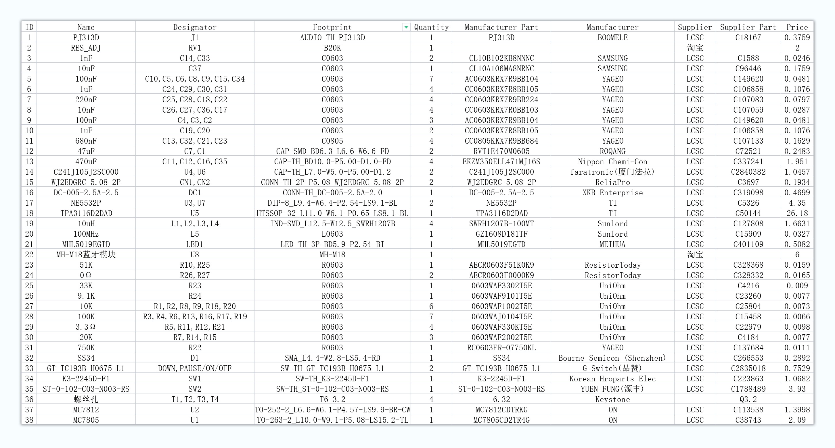 (焊接完成后,蓝牙不工作,7805较烫,拆除蓝牙后恢复正常,刚开始没声音,找不到问题所在,由于买了一套材料,于是搬板焊接了另一块PCB板,终于可以出声了)