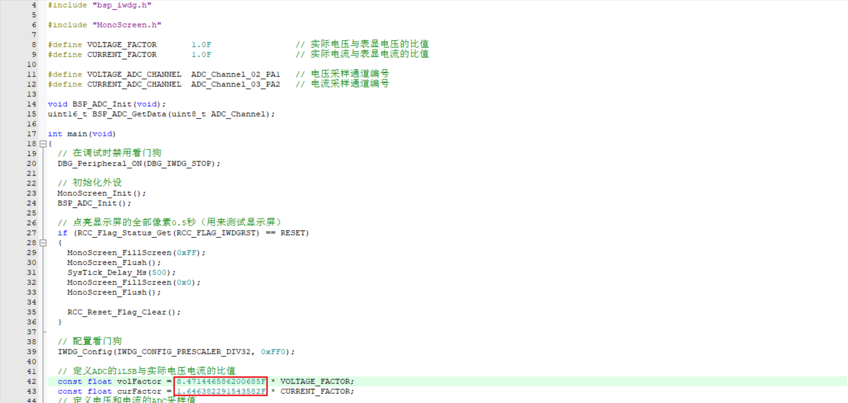 如果采样得到的电压或电流不准,可以根据实际值修改main.c文件中VOLTAGE_FACTOR和CURRENT_FACTOR的值,具体计算公式为: