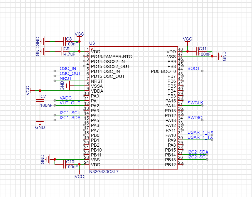 本项目使用的资源不多,使用内部的时钟已经开源满足设计需求,所以无需外接时钟电路。需要注意的是芯片的每个电源的引脚都需要额外接一个100nF的外接的滤波电容,芯片的1脚需要额外接4.7uf的滤波电容。
