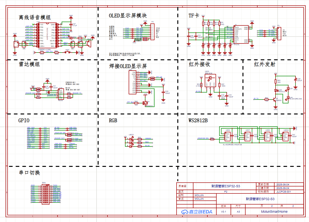 | 主控芯片 | ESP32-S3-WROOM-1-N4 | 双核处理器,4MB 闪存,支持 WiFi/BLE,更换N16R8可以支持语音唤醒 |
