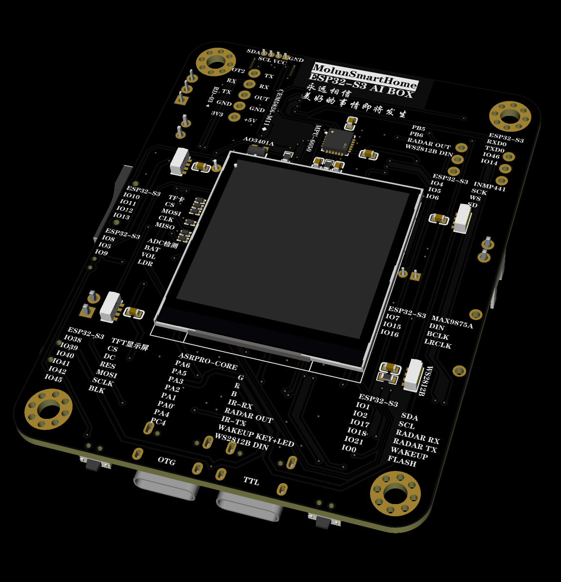 本项目旨在开发一款高度集成的智能控制板,集成语音识别、环境感知、显示控制和智能交互功能。通过优化硬件设计和软件架构,实现以下目标:
