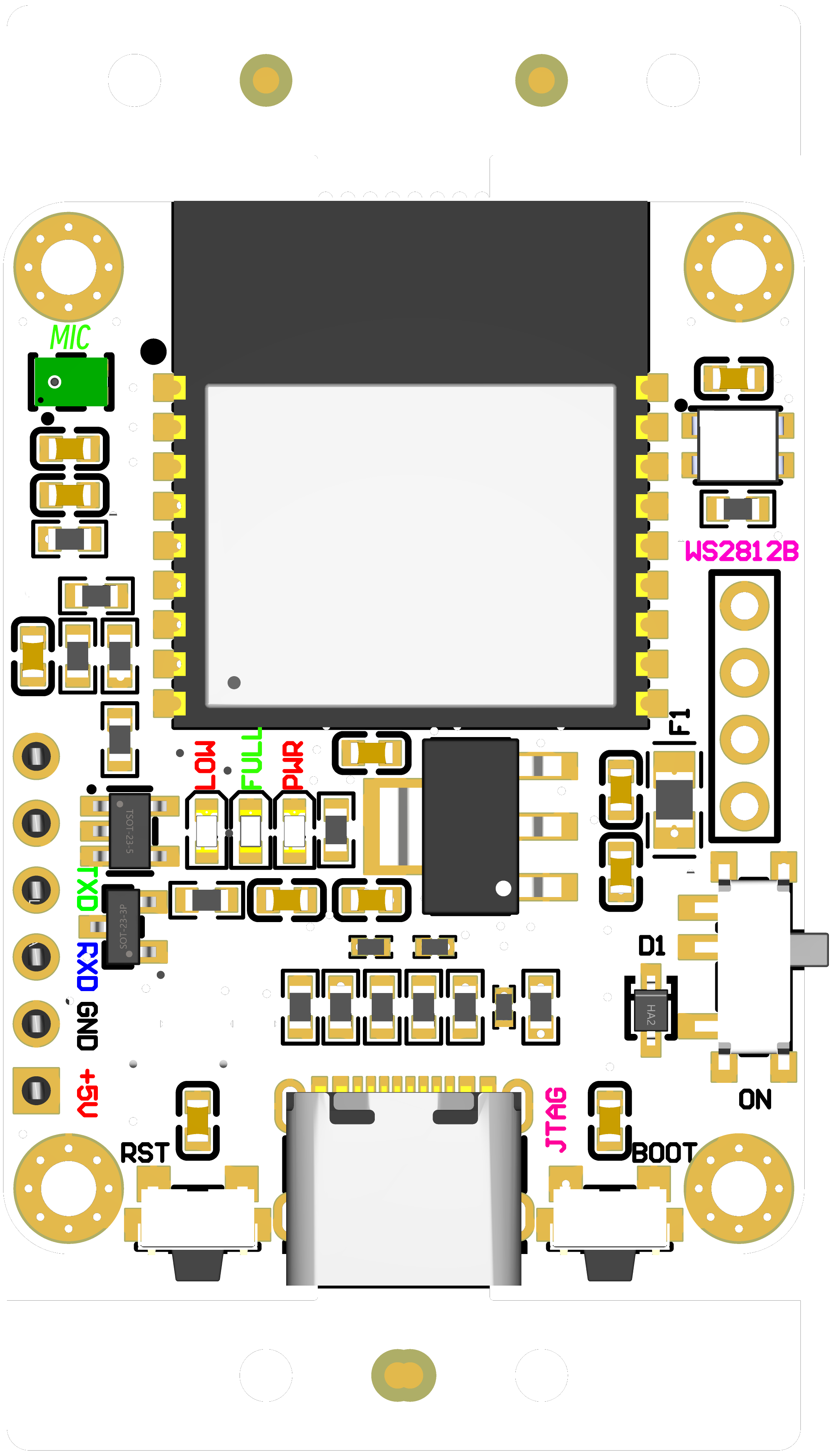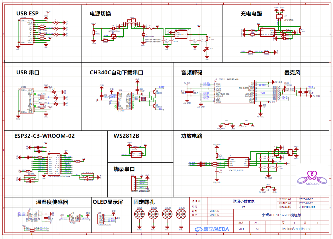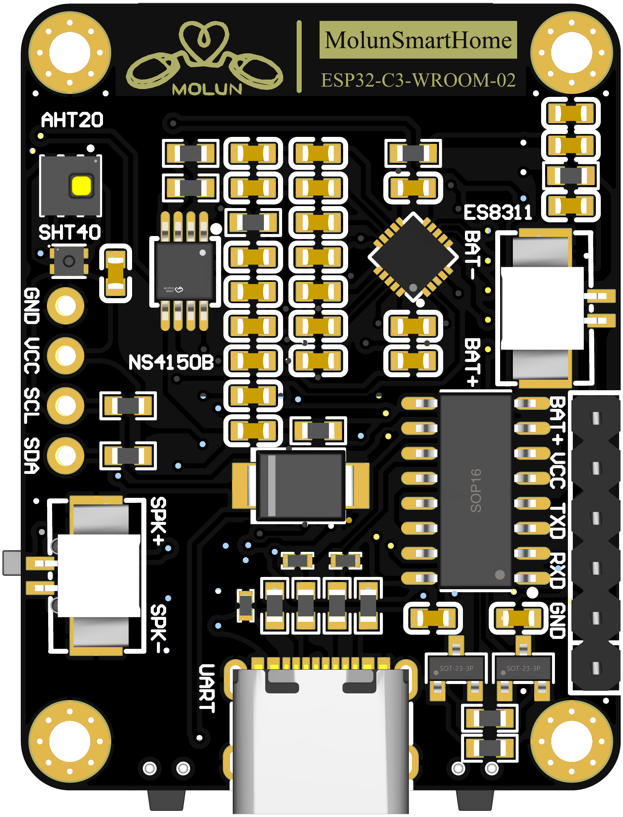 采用ESP32-C3-WROOM-02模组,搭配ES8311、ZTS6216、NS4150B的组合,板载WS2812B灯珠、预留SHT40、AHT20温湿度模块电路,0.96'OLED显示屏,CH340C自动下载电路,接线与虾哥C3版本基本一致,只需修改下功放芯片使能引脚!