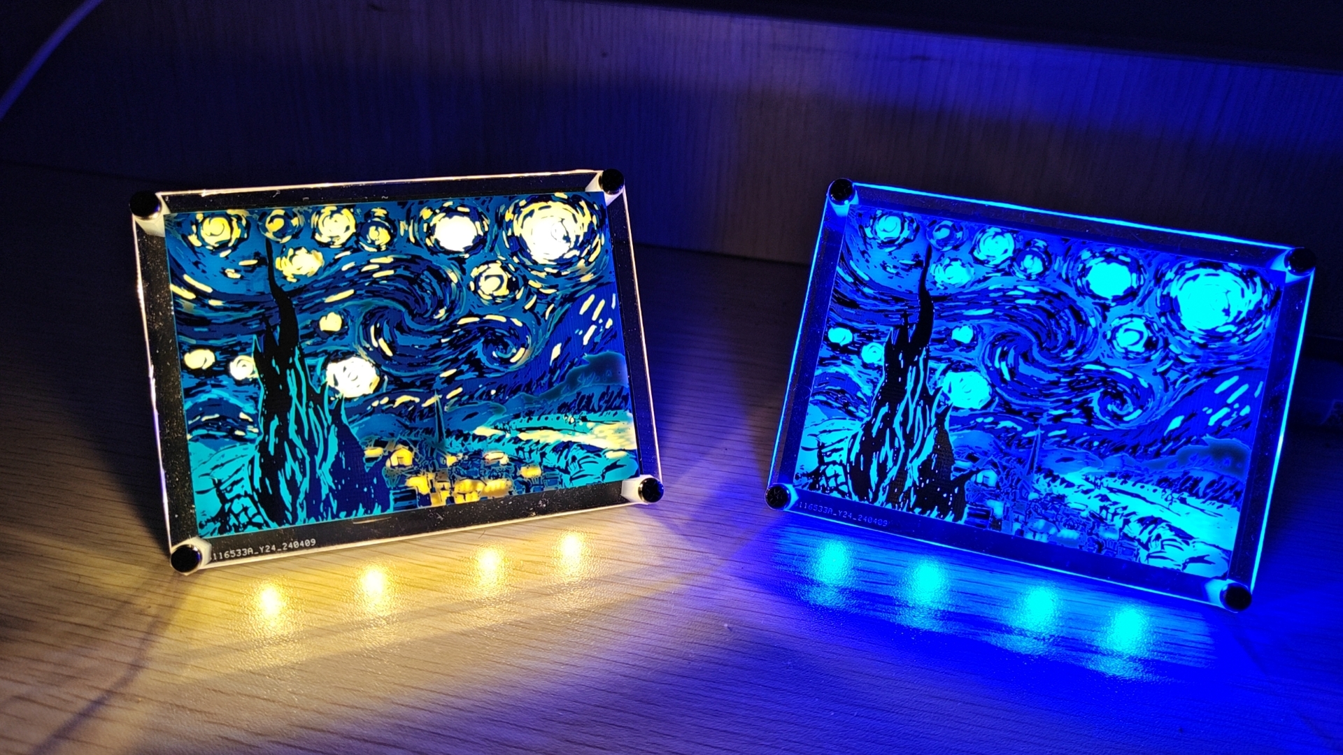 基于作者sytnocui的梵高星空PCB与作者小煜哥哥的IP5306亮瞎眼充电宝,将两者结合、修改制作为梵高星空PCB灯光画。