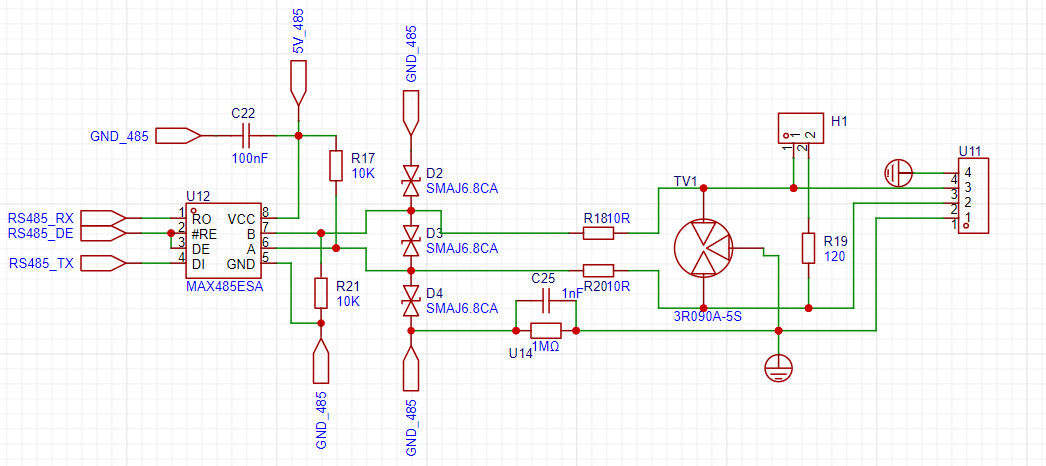 - 隔离RS485:防止485接口误接导致主控电路受损