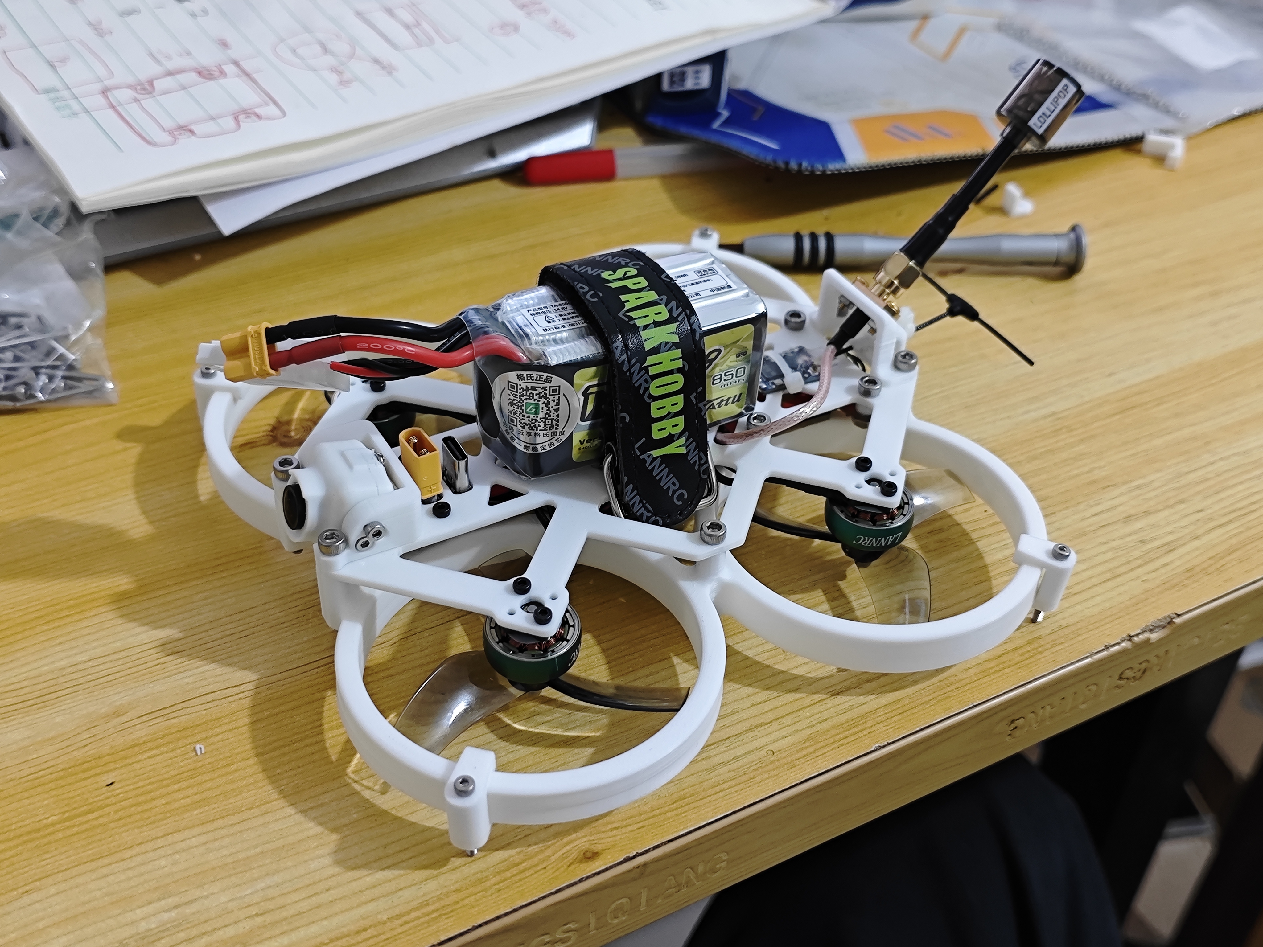 - 电机桨叶固定螺丝突出太高,导致桨叶直接接触地面,暂时打了几个小的支撑柱补救