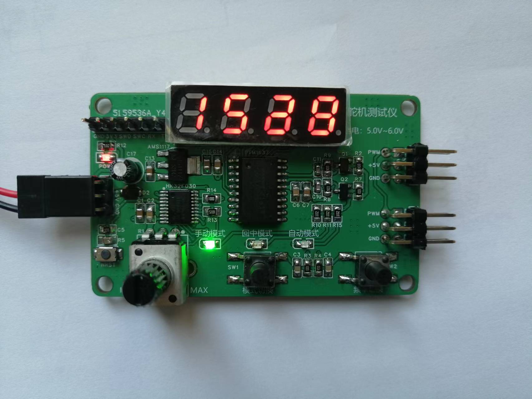 做了一个舵机调试器,用于普通的舵机调试以及无刷电调的测试,功能和网上卖的基本一样,成本相比网上卖的要便宜点。简单介绍一下:项目使用HK32F030MF4P6作为主控,输入5V-6V,并联输出4路PWM,输出50HZ模拟伺服信号(信号宽度800-2200us)或者125HZ数字舵机信号,通电自动进入手动模式,旋转电位器旋钮,通过减小或增大信号的宽度驱动舵机,数码管同时显示信号宽度数字。按“模式切换”键可以选择舵机回中及自动旋转模式。按“频率切换”键可以选择脉宽50HZ或125HZ输出。