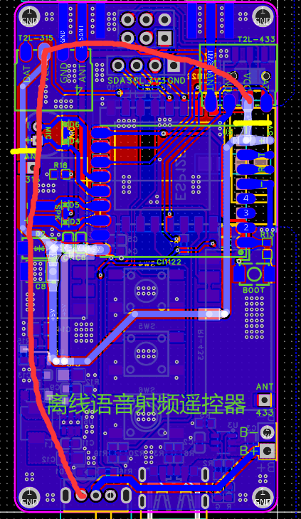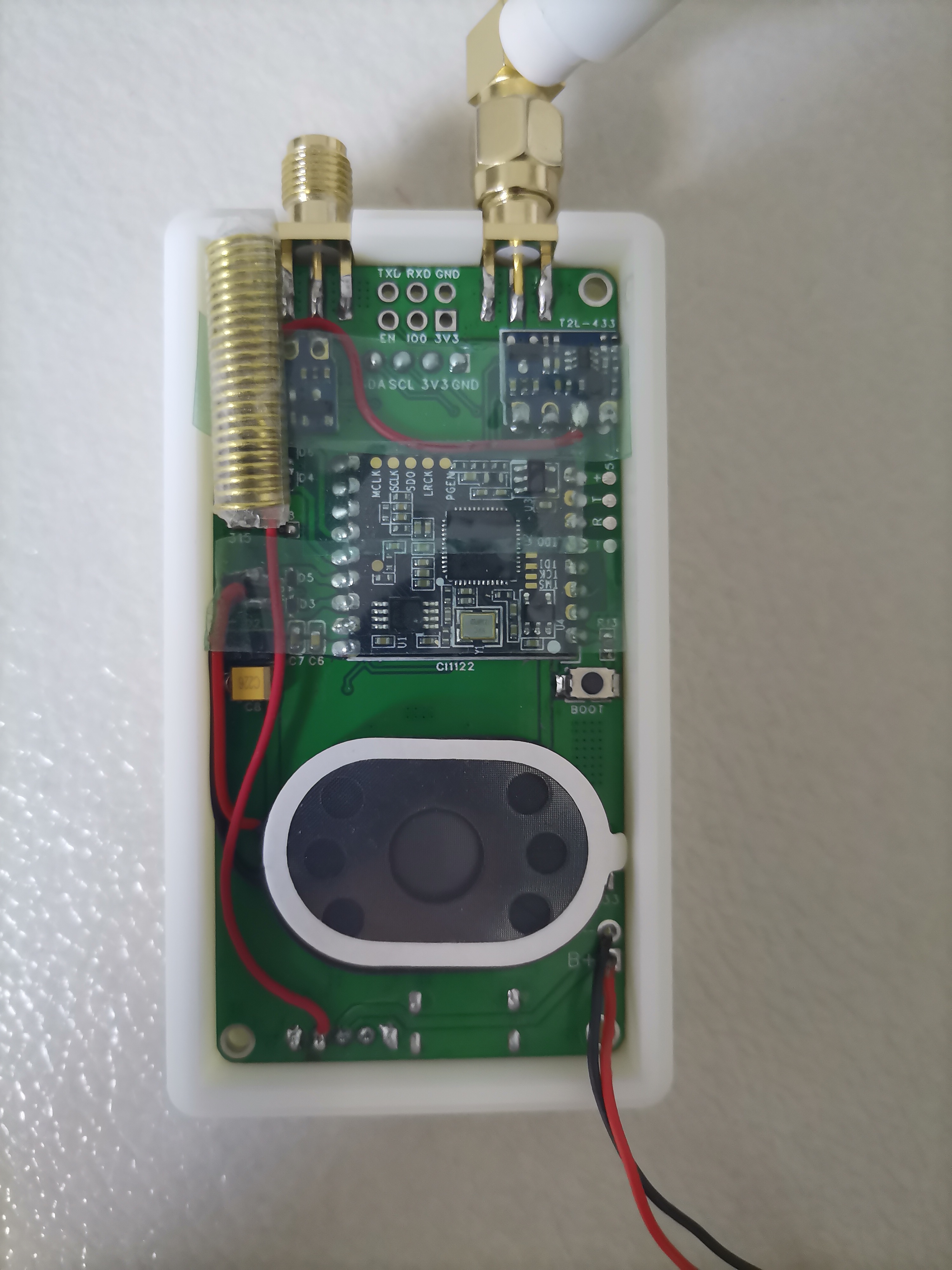主控板上有一处问题,远T2L-433和远T2L-315应该用锂电池直接供电,如果接入5V,会在发射射频时瞬间拉低5V电压导致语音模块重启。因此,需要在电路板上割开走线,并飞线到开关位置。如下图: