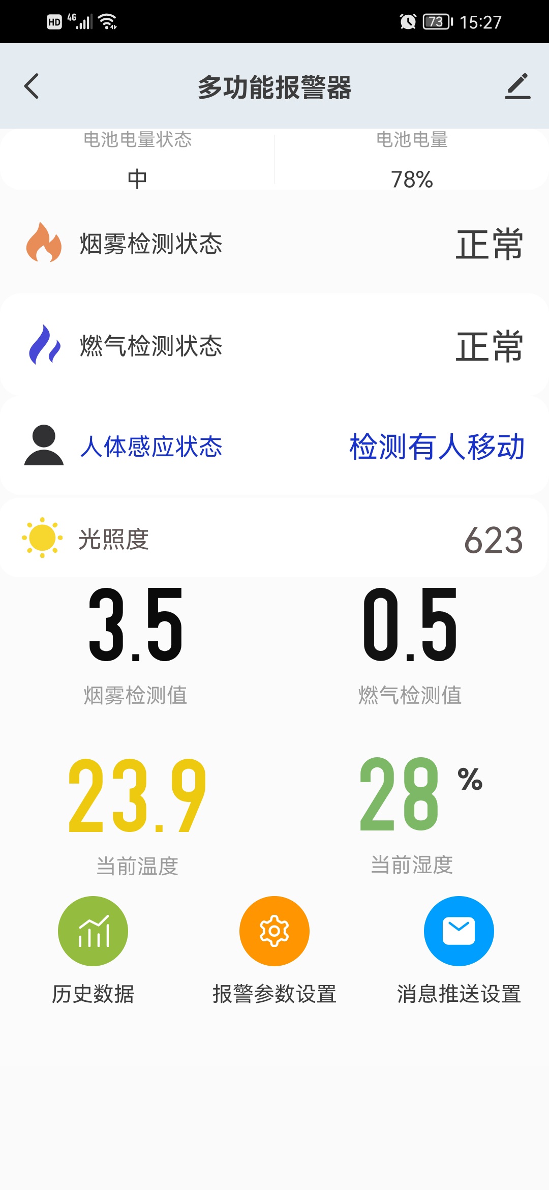 5.APP采用涂鸦自定义界面,首页可显示各传感器的状态以及数值,点击底部的“历史数据”可查看燃气、烟雾、温度、湿度、光照历史曲线图;“报警参数设置”页面可打开或关闭报警器,开启或关闭蜂鸣器、设置报警时长、报警铃声等参数;“消息推送设置”页面可开启APP消息推送功能,APP退出也可以在手机消息栏收到报警提醒。