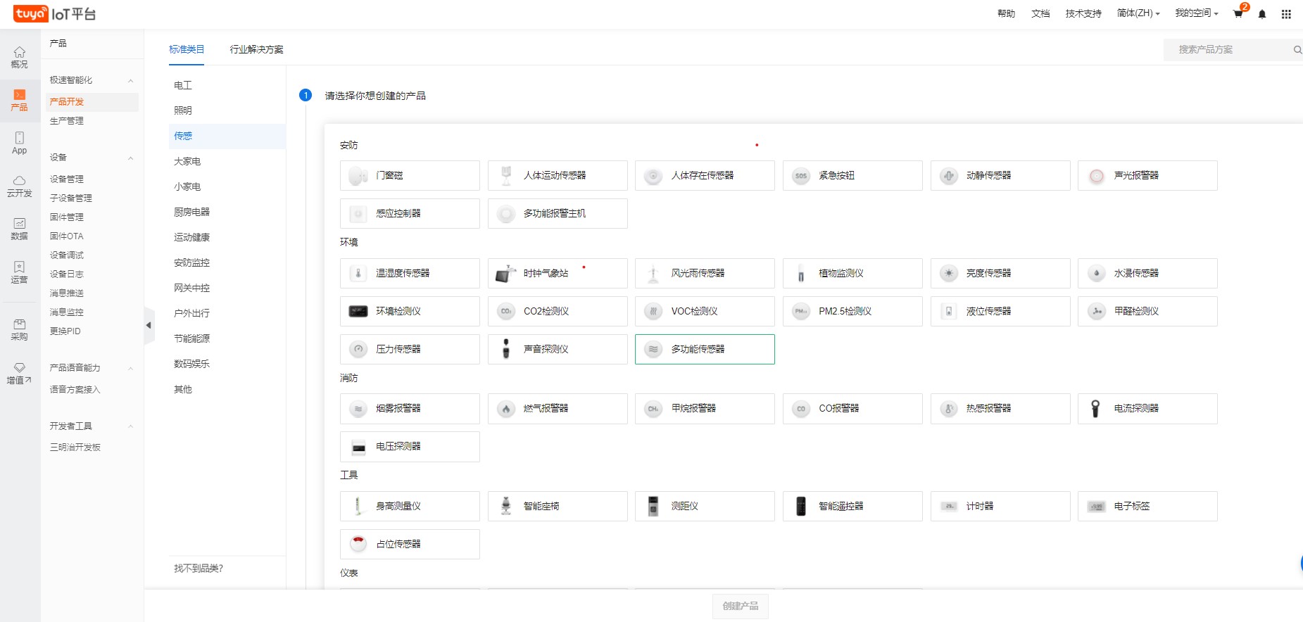 1.首先在涂鸦loT平台创建产品,选择“多功能传感器”