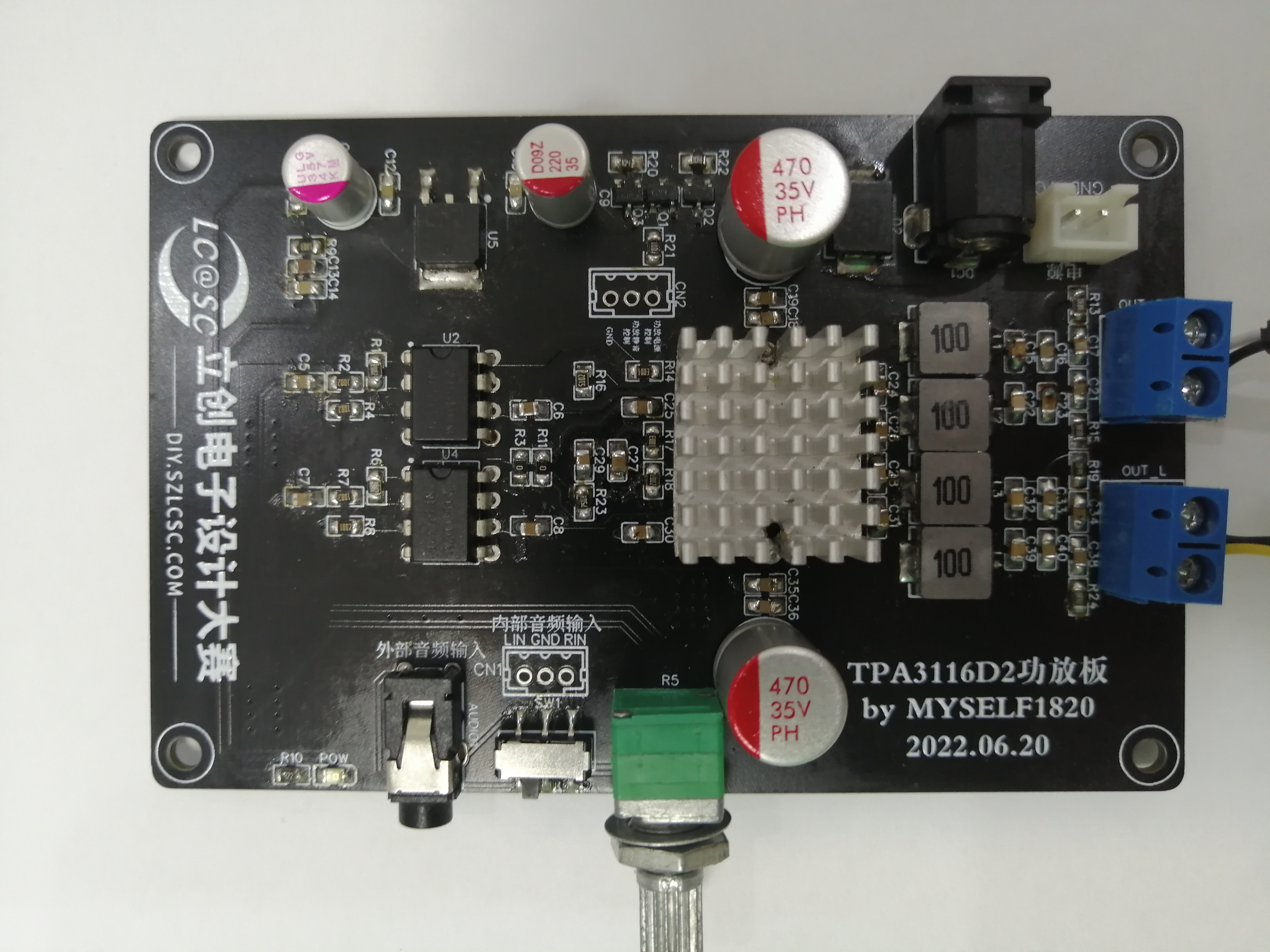 功放板:音频功率放大器采用TPA3116D2DAD,前级采用NE5532放大电路。功放音频输入可采用外部输入(外部音频插头)或者内部输入(主控板音频输出线),具体由双排两档开关来控制。