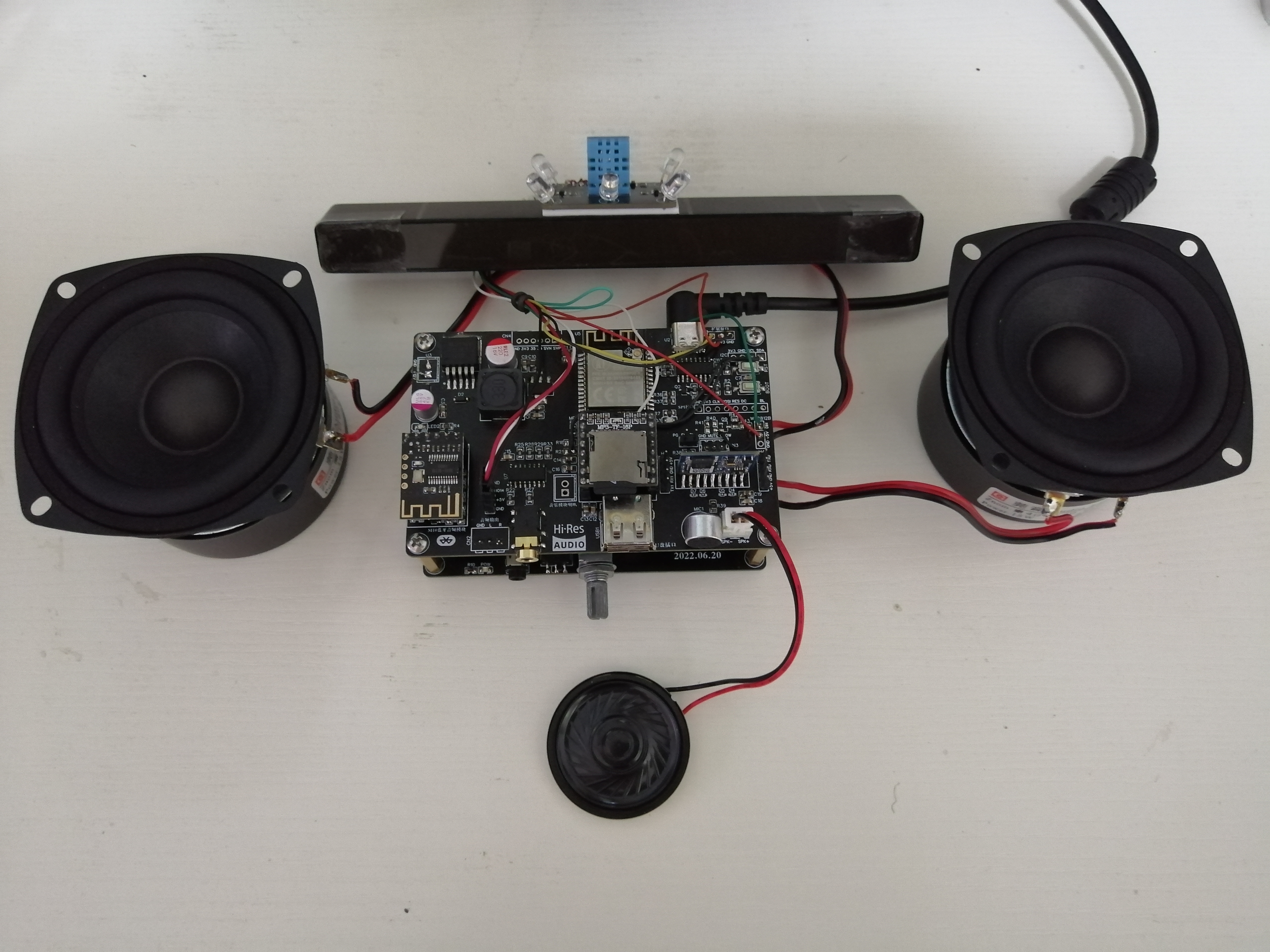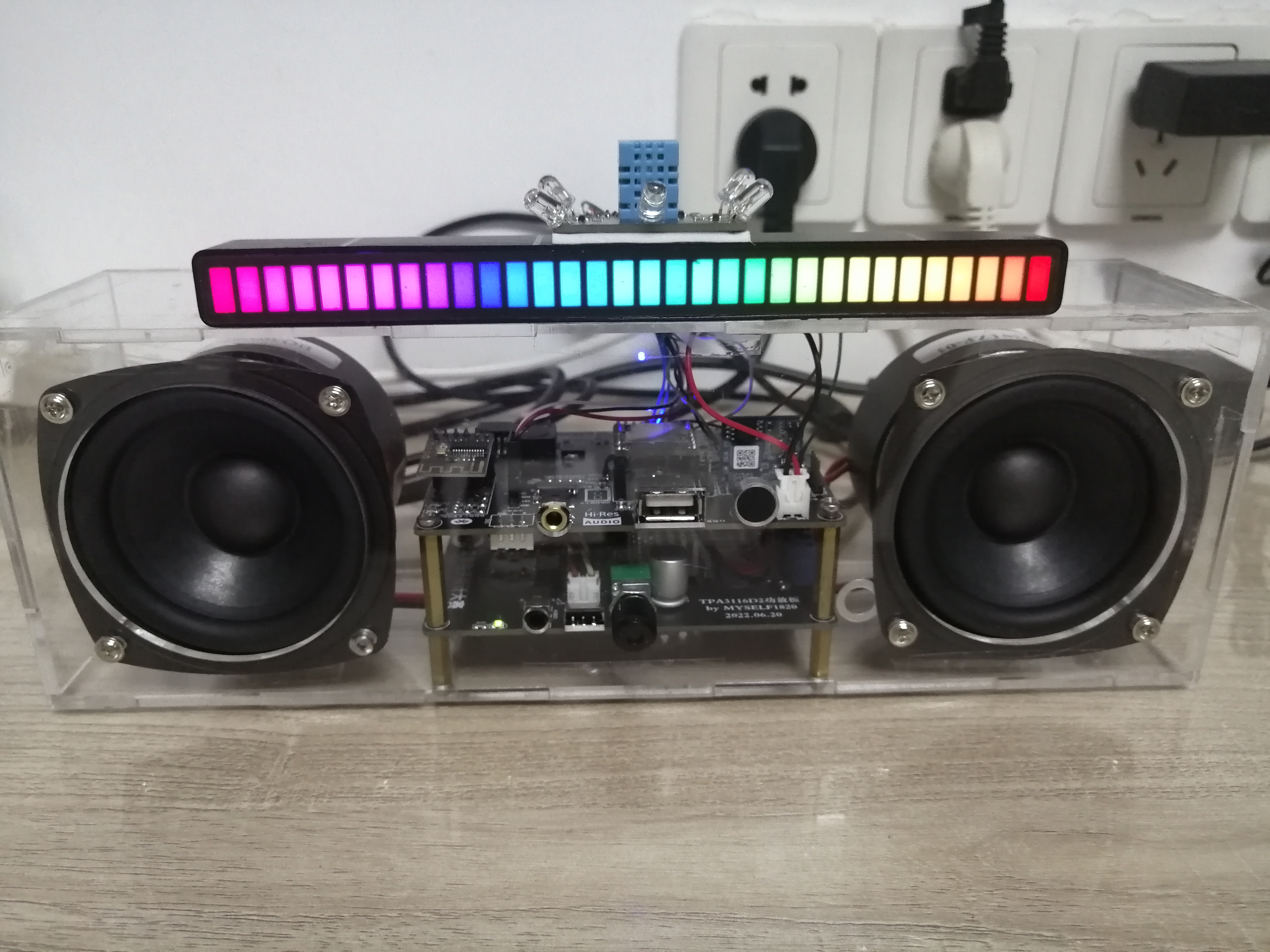 家里的功放不是智能的,每次想听歌的时候都得自己手动打开,很麻烦;还有一个小度音箱,听歌很方便,功能也很强大,唯一不足的是音箱效果一般,而且是单声道的。因此,突然有了制作了一个智能音箱的想法,集成功放和离线语音控制的音乐播放电路,既能播放MP3也能播放手机蓝牙歌曲,还能控制家里的红外遥控的电器、播报室内的温湿度,还能控制音乐节奏灯,听歌的时候更有感觉。