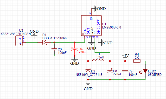 电源部分采用LM2596S-5.0,输入电压18V,输出5V,输出电流最大可达3A(也许有人会问为什么不用LDO,因为输出电流不够,而且发热比较严重),使用DC-DC有个问题,对音频电路会产生影响,解决办法只能是多加滤波电容。一开始设计的时候考虑不周,滤波做的不够。