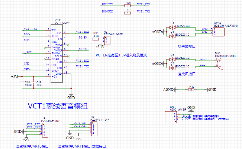 VCT1离线语音模块的PWM4 和PWM5输出高低电平用来控制功放的电源和静音。语音命令通过模块的串口1和ESP32通信,麦克风直接焊在板子上,模块使用一个8欧姆2瓦的喇叭用来语音播报。