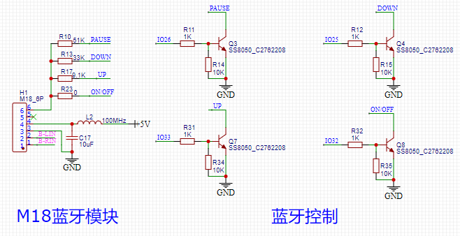 M18蓝牙音频模块需要用按键或者手机来控制,这里我使用一组三极管电路来模拟按键,通过ESP32四路IO来控制。
