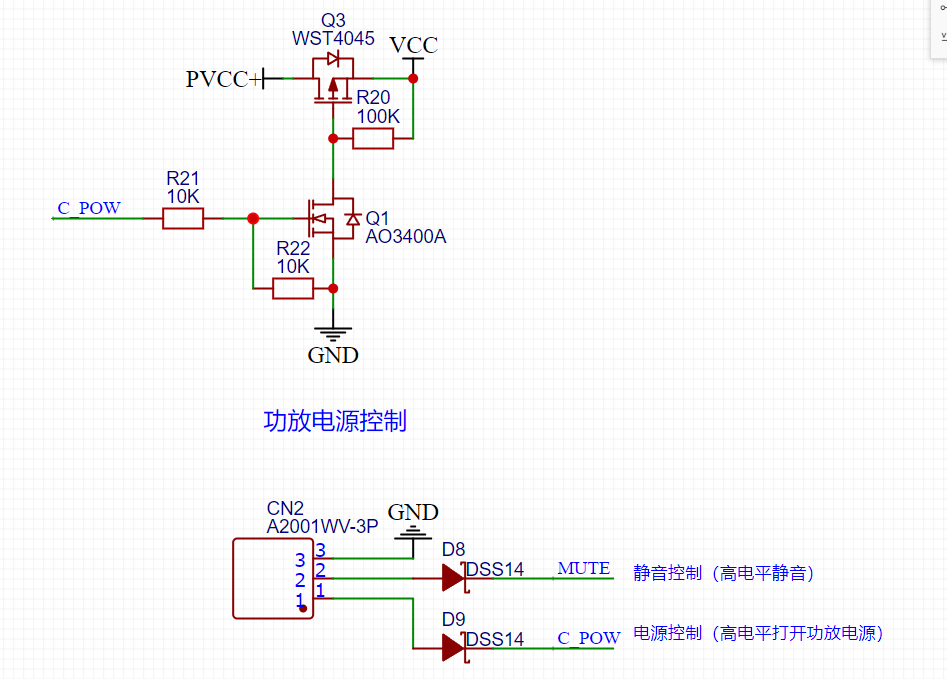 功放电源采用MOS管控制,引出了功放电源控制和功放静音控制接口