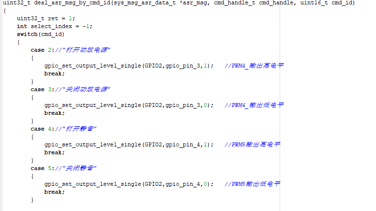 主程序里根据命令词的语义ID来确定哪个IO口控制什么,输出高电平还是低电平。