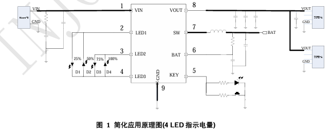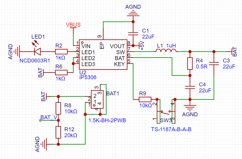 上图为官方数据手册的参考电路设计原理图,太多的LED电量显示灯放在电路板上反而会不好看,所以计划保留一个指示灯用于充放电指示,在设计一个电量检测电路在屏幕上显示当前电量。
