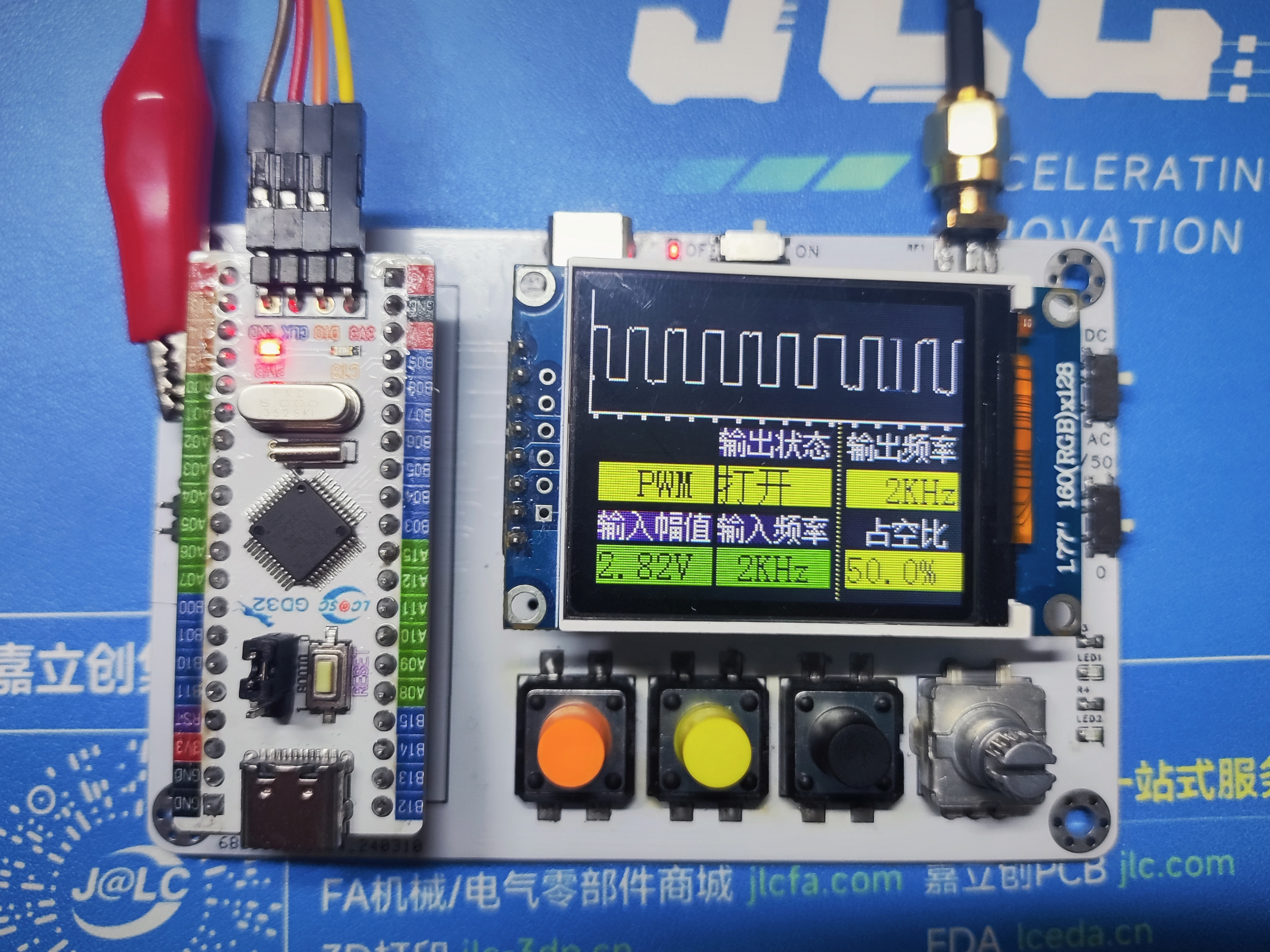 if((*value).ouptputbit == 1) { TFT_ShowChinese(55,72,(uint8_t *)"打开",BLACK,YELLOW,16,0); } else { TFT_ShowChinese(55,72,(uint8_t *)"关闭",BLACK,YELLOW,16,0); } if((*value).outputFreq>=1000) { sprintf(showData,"%3dKHz",(*value).outputFreq/1000); TFT_ShowString(110,72,(uint8_t *)showData,BLACK,YELLOW,16,0); memset(showData,0,32); } else { sprintf(showData," %3dHz",(*value).outputFreq); TFT_ShowString(110,72,(uint8_t *)showData,BLACK,YELLOW,16,0); memset(showData,0,32); }
