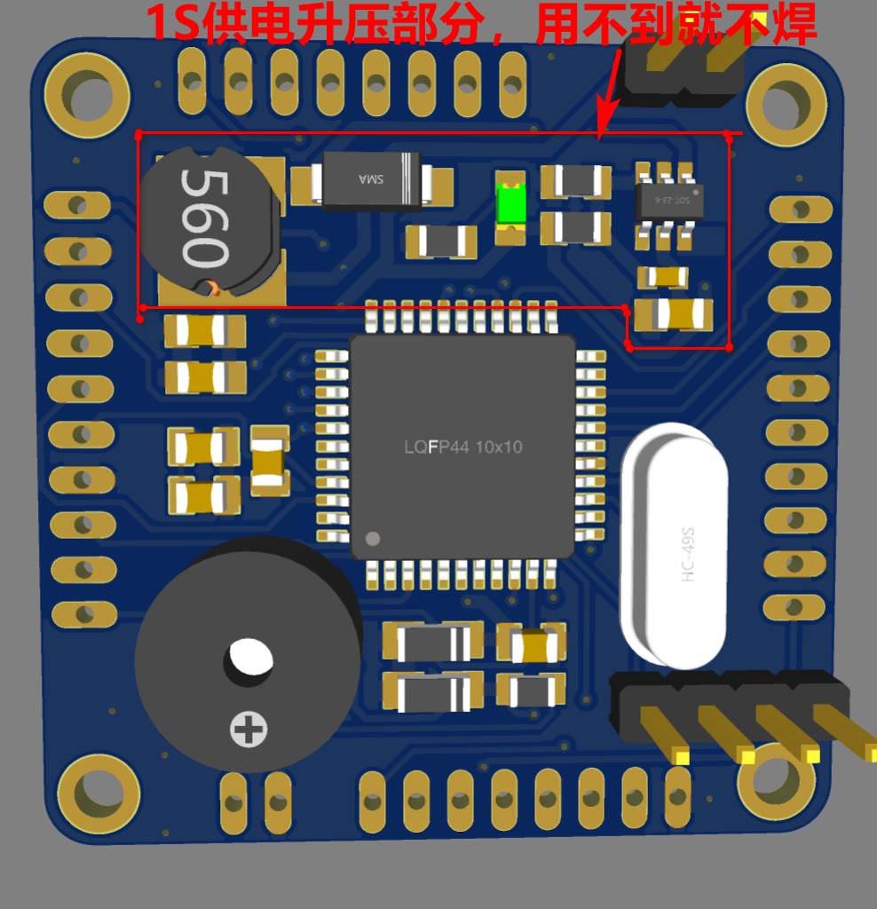 2. 升压部分使用的B628芯片,2-3S供电直接不用焊这一部分,别忘了短接背面焊盘。