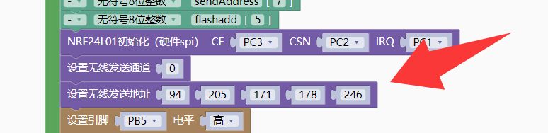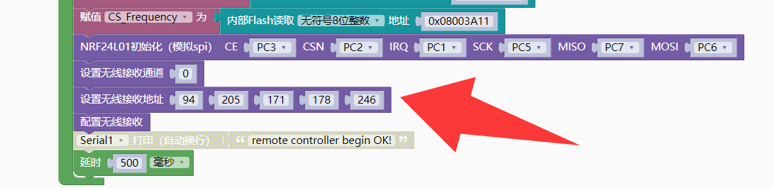 使用天问block打开“遥控器固件程序->手柄接收机.hd”程序文件,修改这里的通讯地址,这里以94:205:171:178:246来举例。