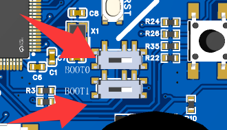 注意:手柄端通电前,拨动开关保持其BOOT0开关在左,BOOT1开关在右的状态,然后再连接USB线通电。连接好后,若此时电脑检测到一个U盘设备说明已经成功了。