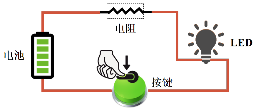 该电路是一个按键控制LED电路,电路使用电池供电、电阻限流,通过按键控制电路的通断,进而控制发光二极管(Light Emitting Diode,LED)的亮灭。