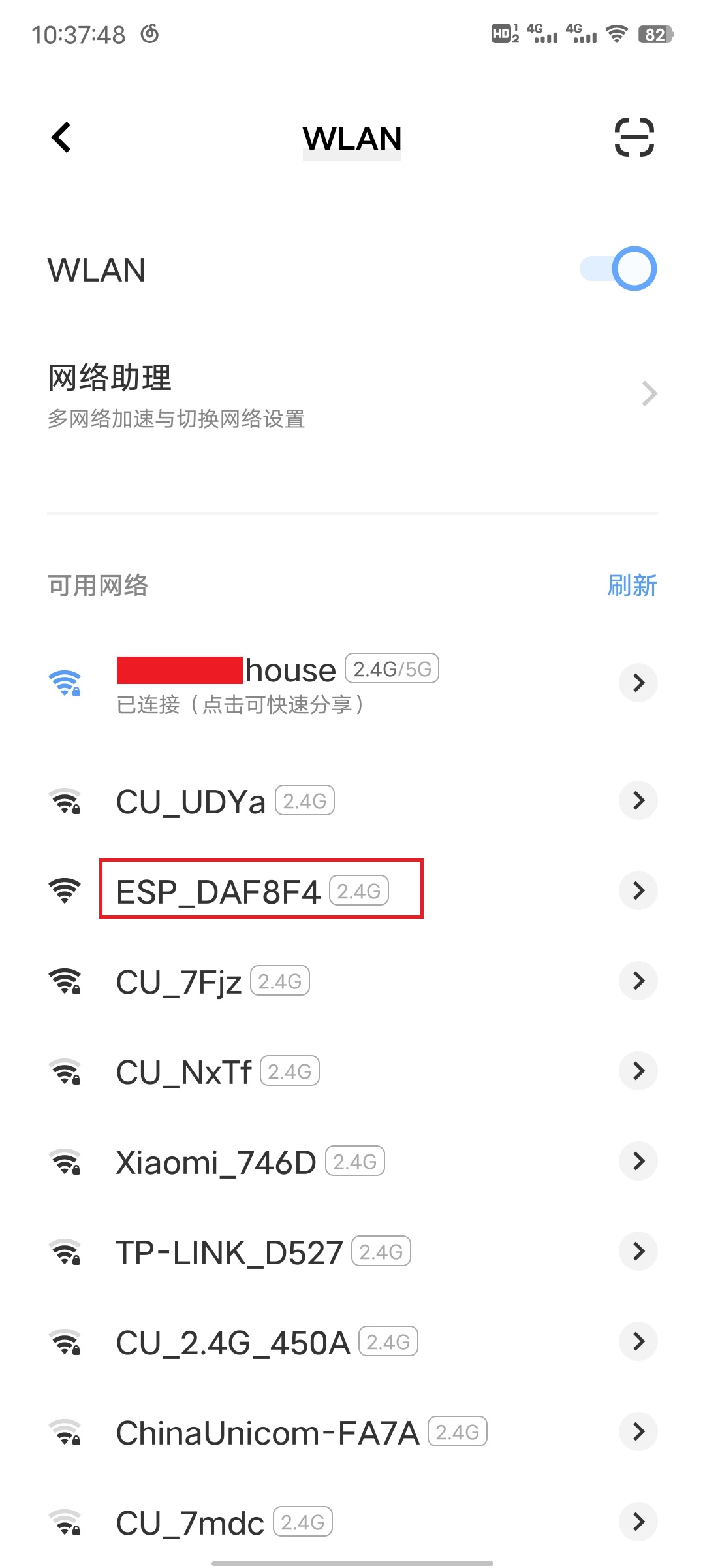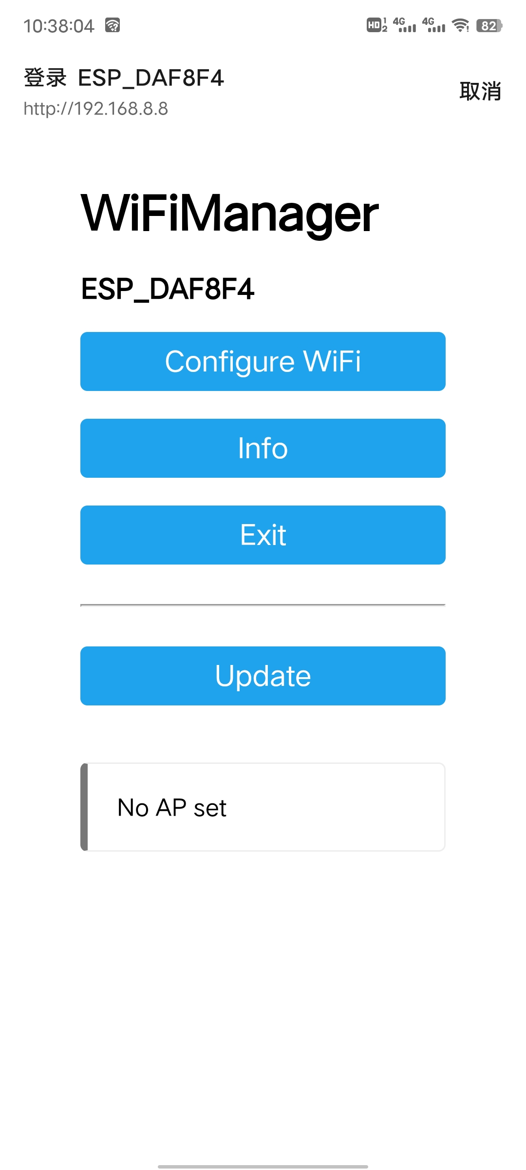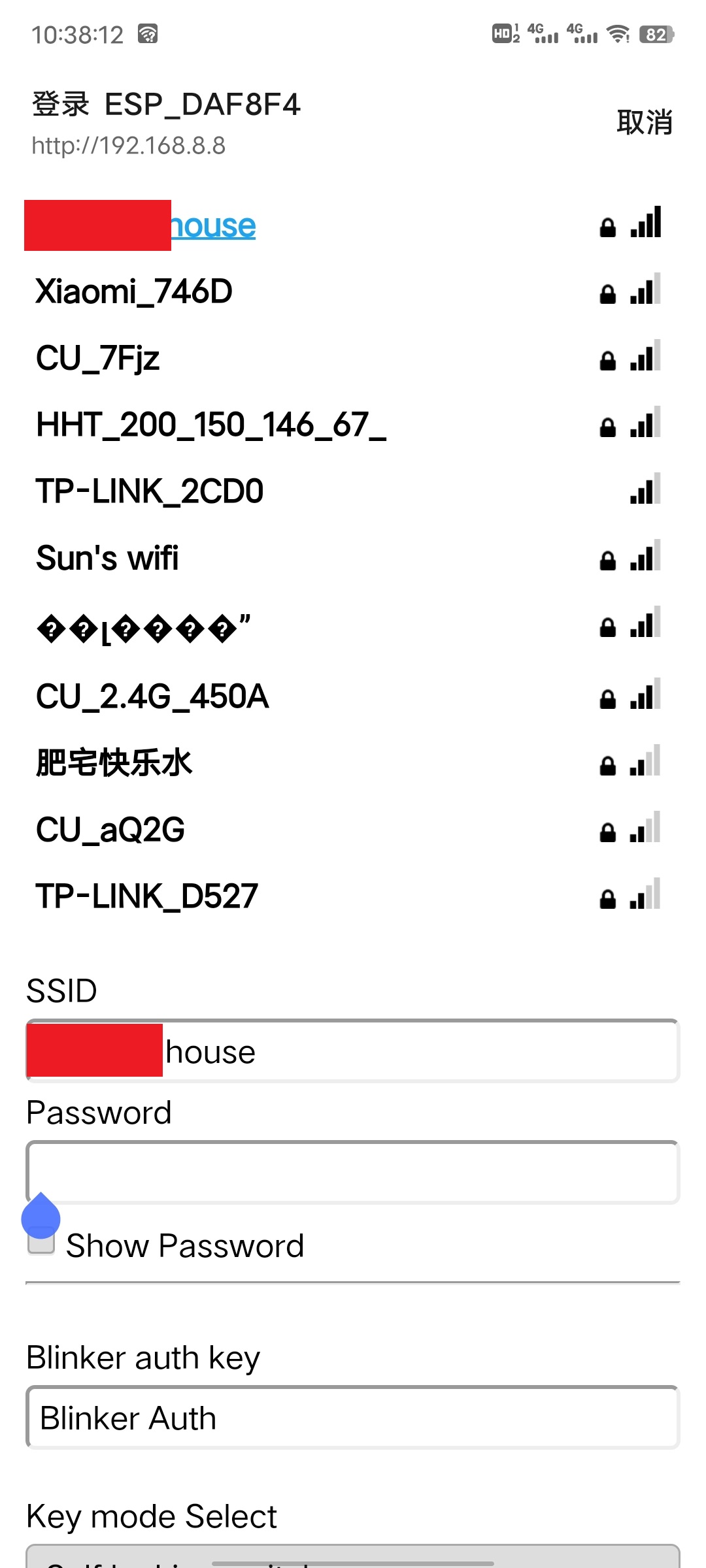 上电后会自动进入配网模式,选择ESP开头的这个wifi连接,浏览器会自动跳转到192.168.8.8