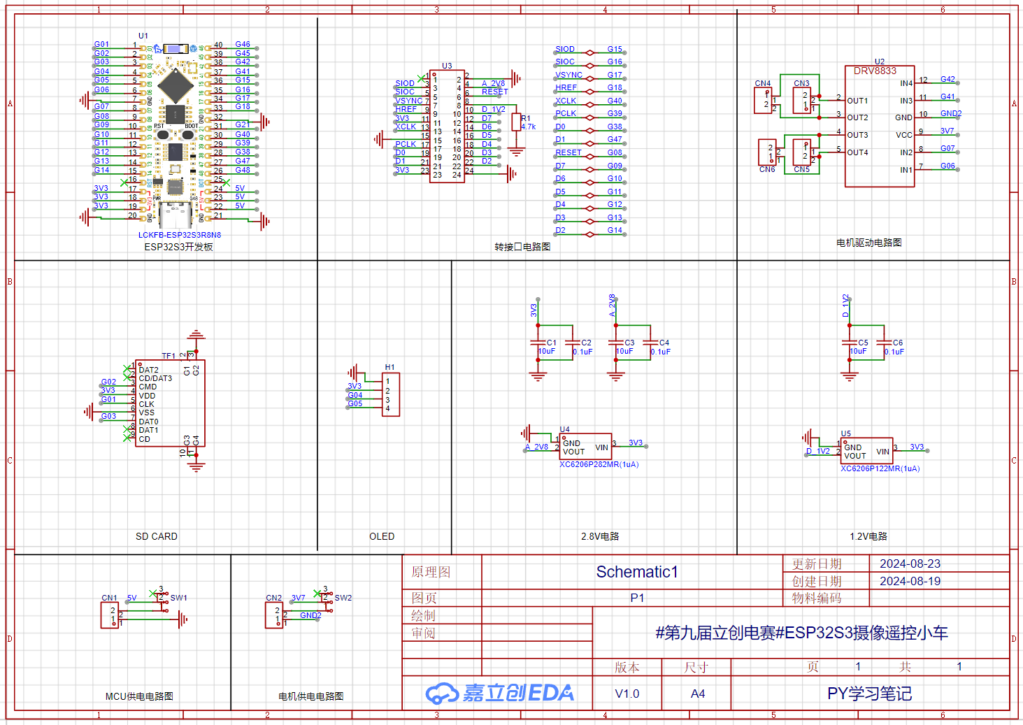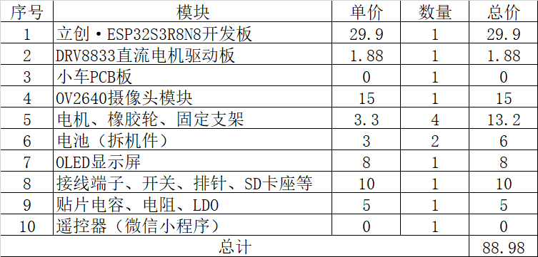 本项目基于立创·ESP32S3R8N8开发板、DRV8833直流电机驱动板、OV2640摄像头、OLED显示屏、锂电池、电机、橡胶轮等元件,成本不到100元(详见BOM表)。小车采用两路电源供电,具有低成本、静音、稳定、长续航等特点,适合中小学生学习、二次开发。