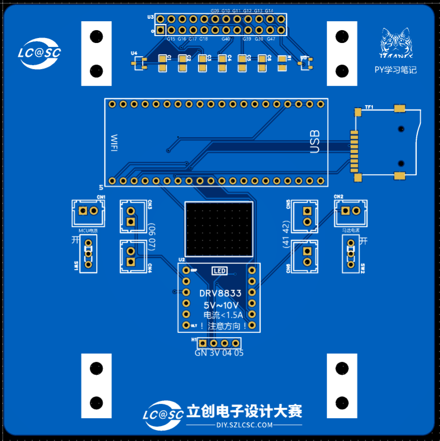 因需要使用到OV2640摄像头,PCB板增加了不省贴片电容、电阻,以及LDO、SD卡等,增加了焊接难度。ESP32S3、DRV8833、OV2640摄像头等模块采用2.54排针固定,电池、电机采用XH2.54插件连接,方便焊接、组装,以及元件重复利用。