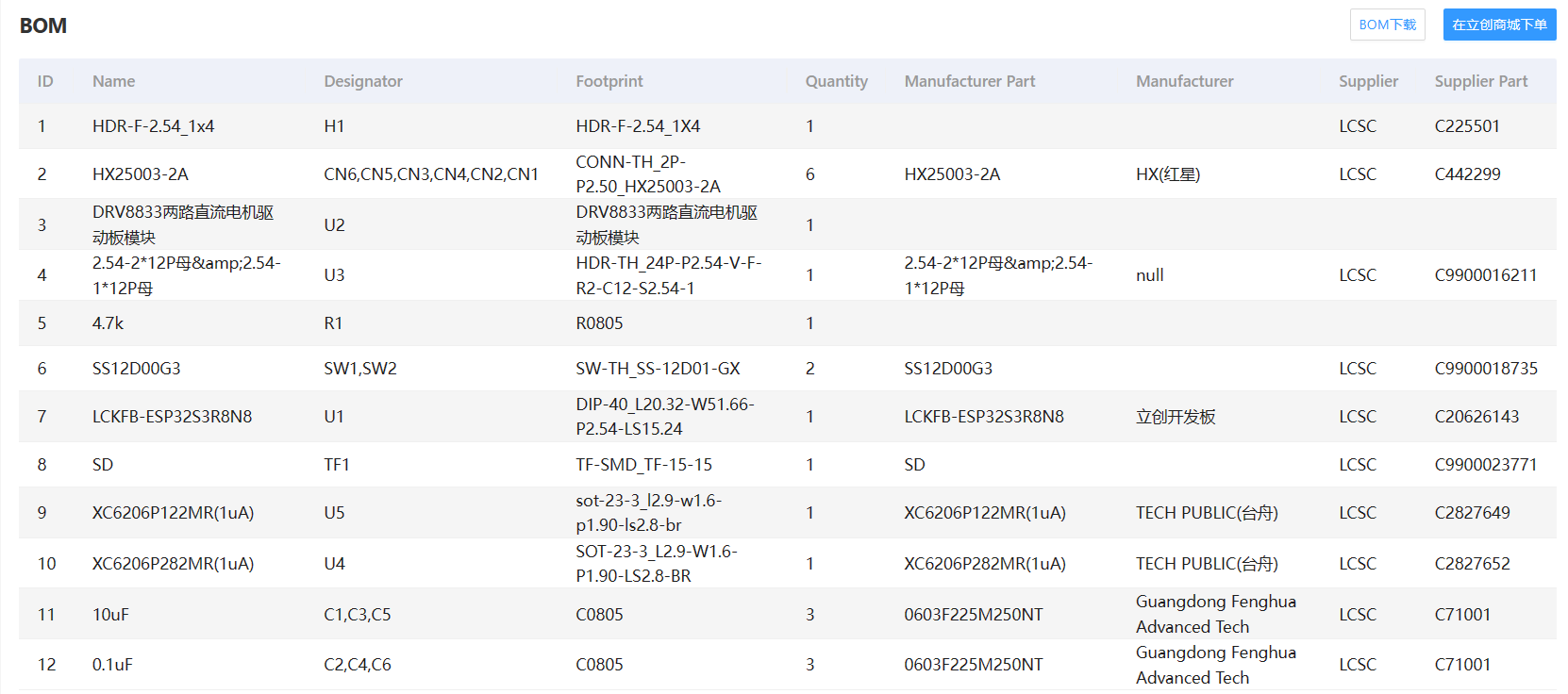 注:项目涉及的BOM清单。在嘉立创EDA 生成/上传设计文件后,BOM将自动生成至项目详情;建议包括型号、品牌、名称、封装、采购渠道、用途等内容。具体内容和形式应以表达清楚项目构成为准。