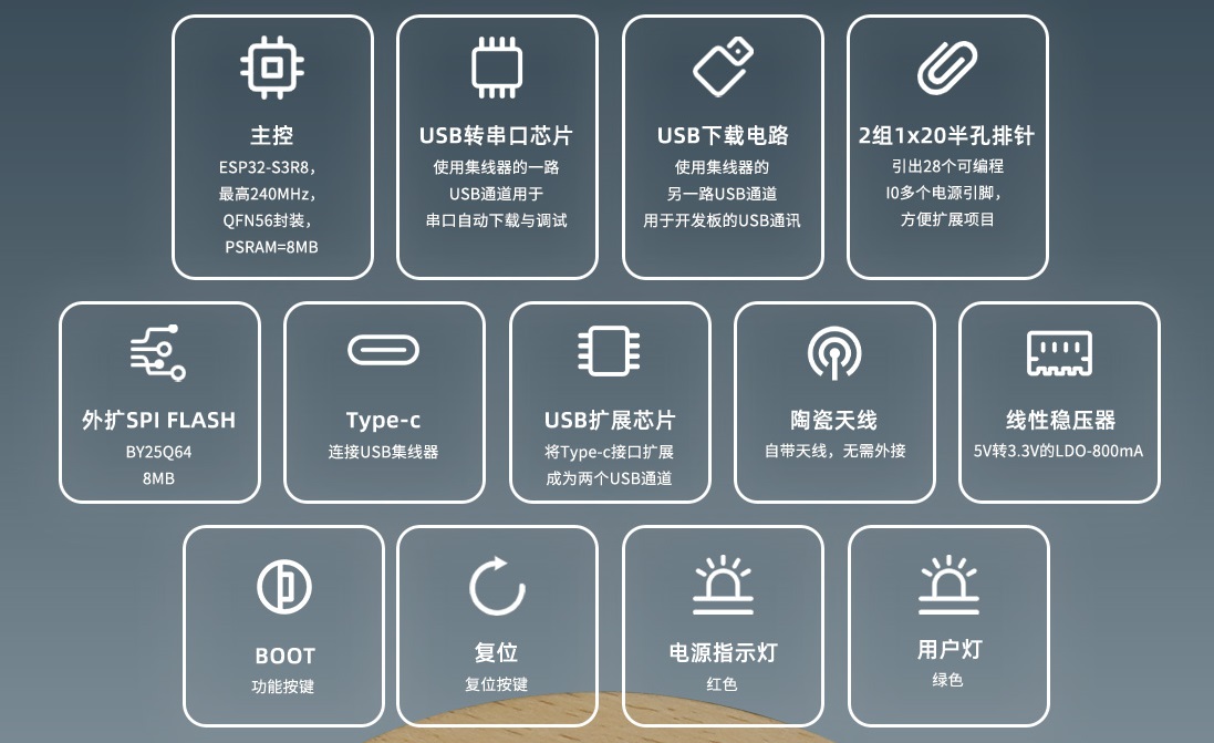 采用立创·ESP32S3R8N8开发板,高性能随身WiFi与蓝牙开发板,所有资料全开源,丰富教程案例,轻松上手,项目式学习。支持以下功能: