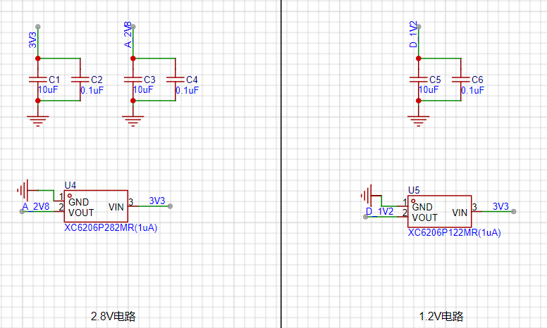 因摄像头还需要用到2.8V和1.2V,所以增加了两路降压电路,分别采用XC6206P282MR、XC6206P122MR的LDO将3.3V降到2.8V和1.2V,供摄像头使用。