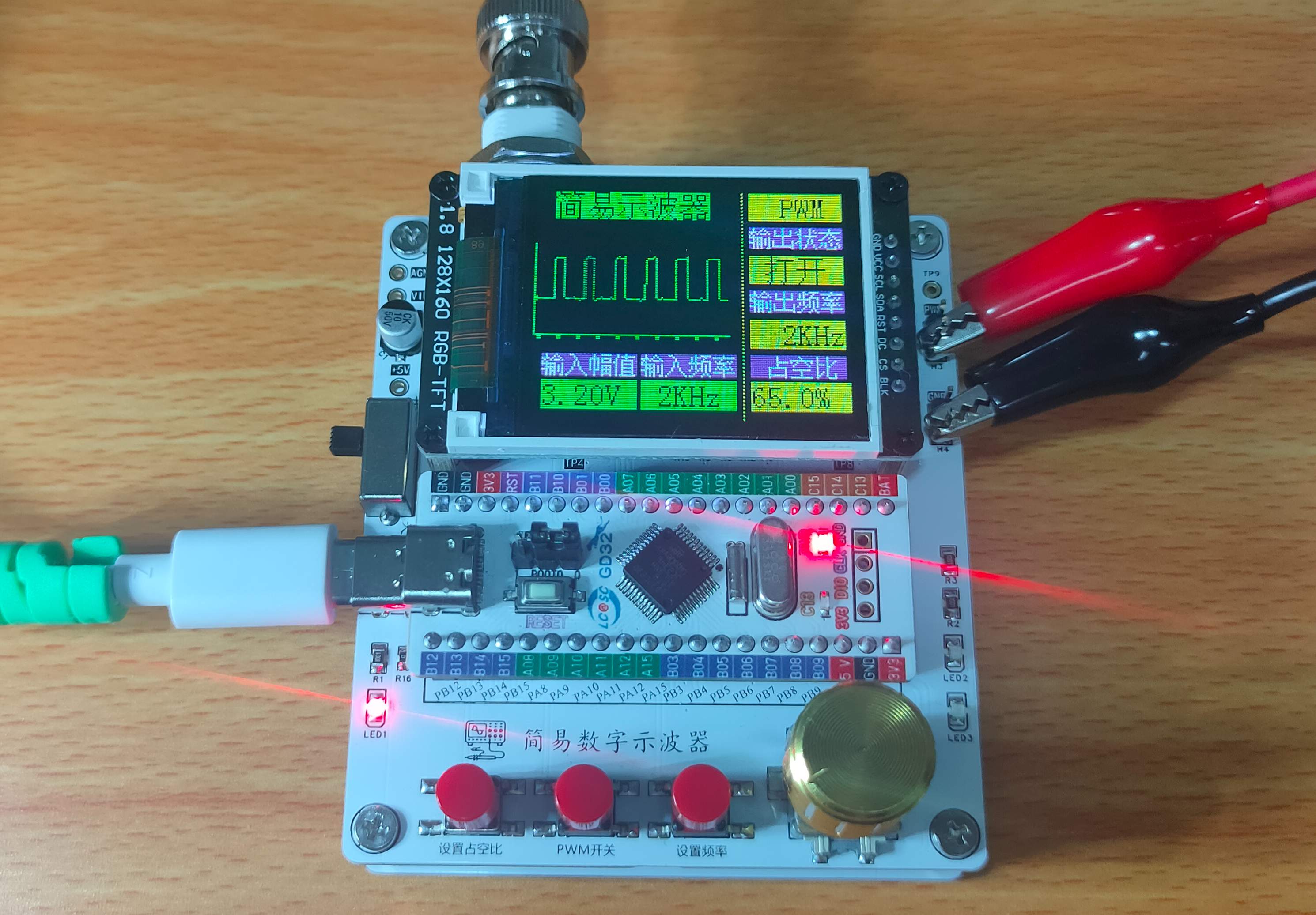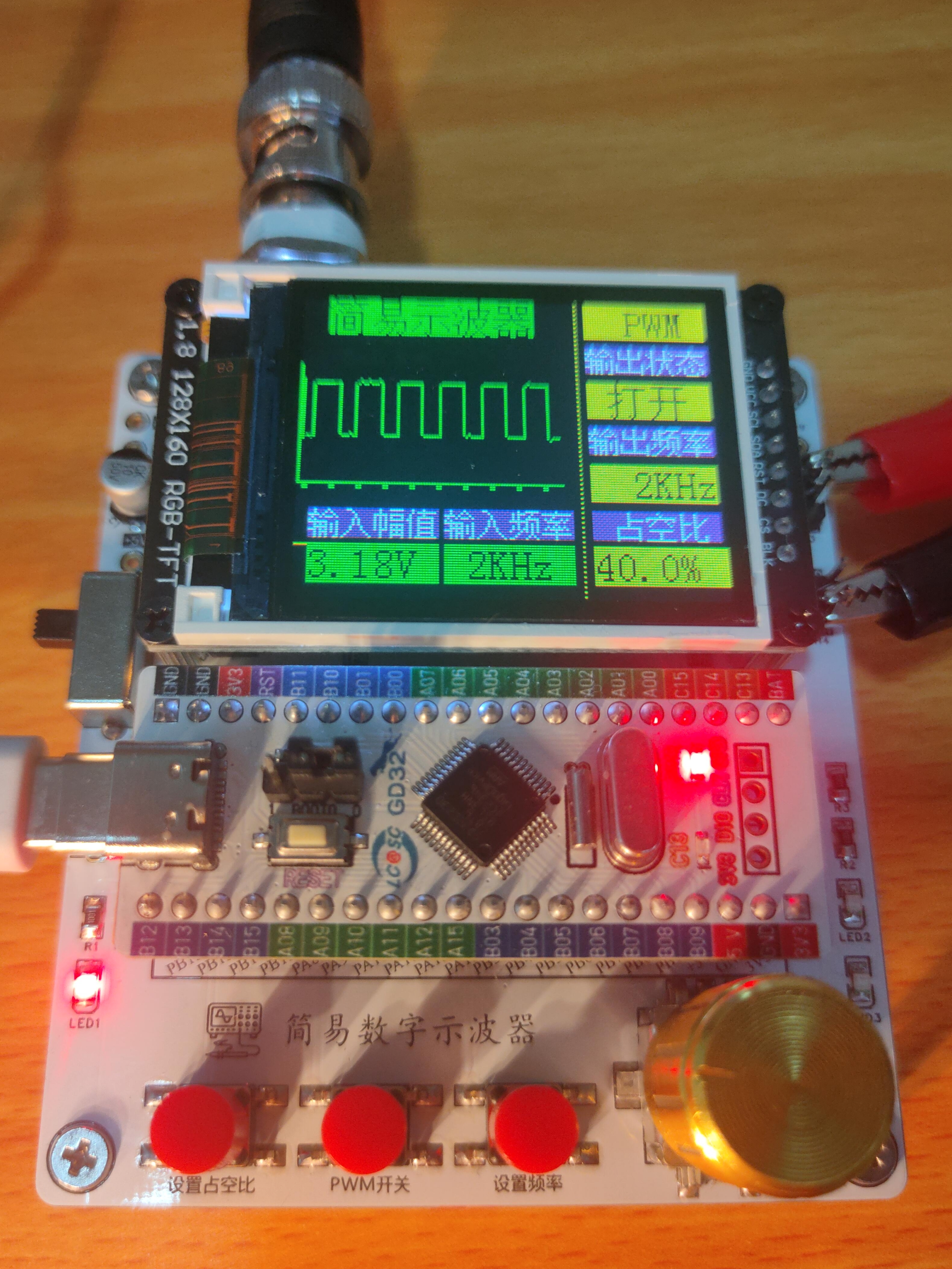 简介:为了有一台属于自己的示波器,我来了。虽然只能测测低频信号,但这可是自己的第一台示波器哇!果断冲! 这台示波器是基于GD32E230开发的,采用1.8寸的TFT屏显示。单通道采样,PWM波可调节输出。开源协议