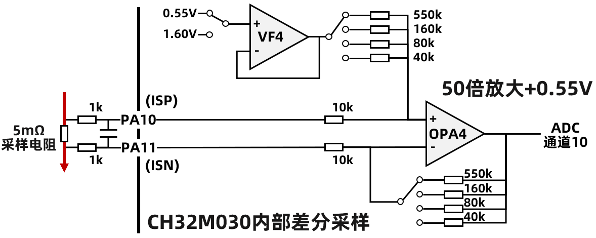 CH32M030内部的运放可以很方便地配成高增益的差分输入,本方案将采样电阻上的电压放大50倍后加偏置送给ADC进行采样。
