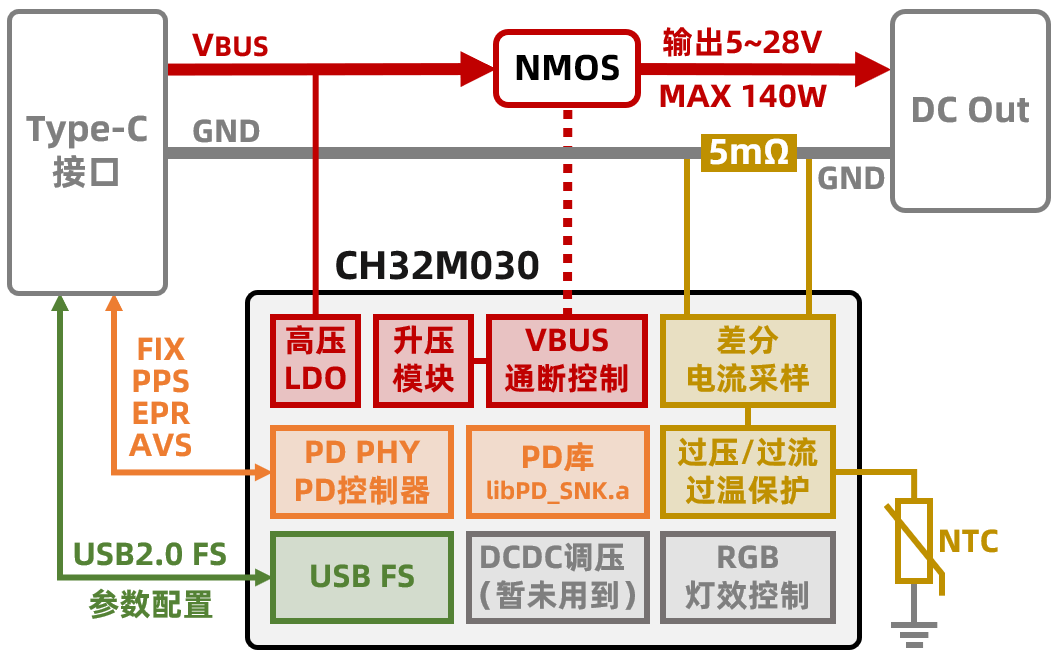 CH32M030内部的高压LDO支持5~28V电源。本设计中,Type-C接口最高输出140W(28V@5A),VBUS电压正好落在高压LDO工作范围中,因此芯片直接从VBUS上取电,无需外部高压LDO。